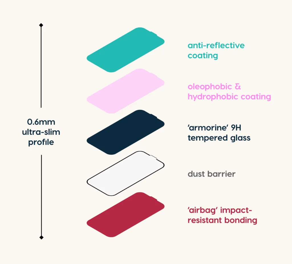 - Layer 1: Anti-reflective coating. Enjoy 3x fewer reflections vs a bare phone screen and 4x fewer reflections when compared to other tempered glass protectors without haze, texture, or color shift.